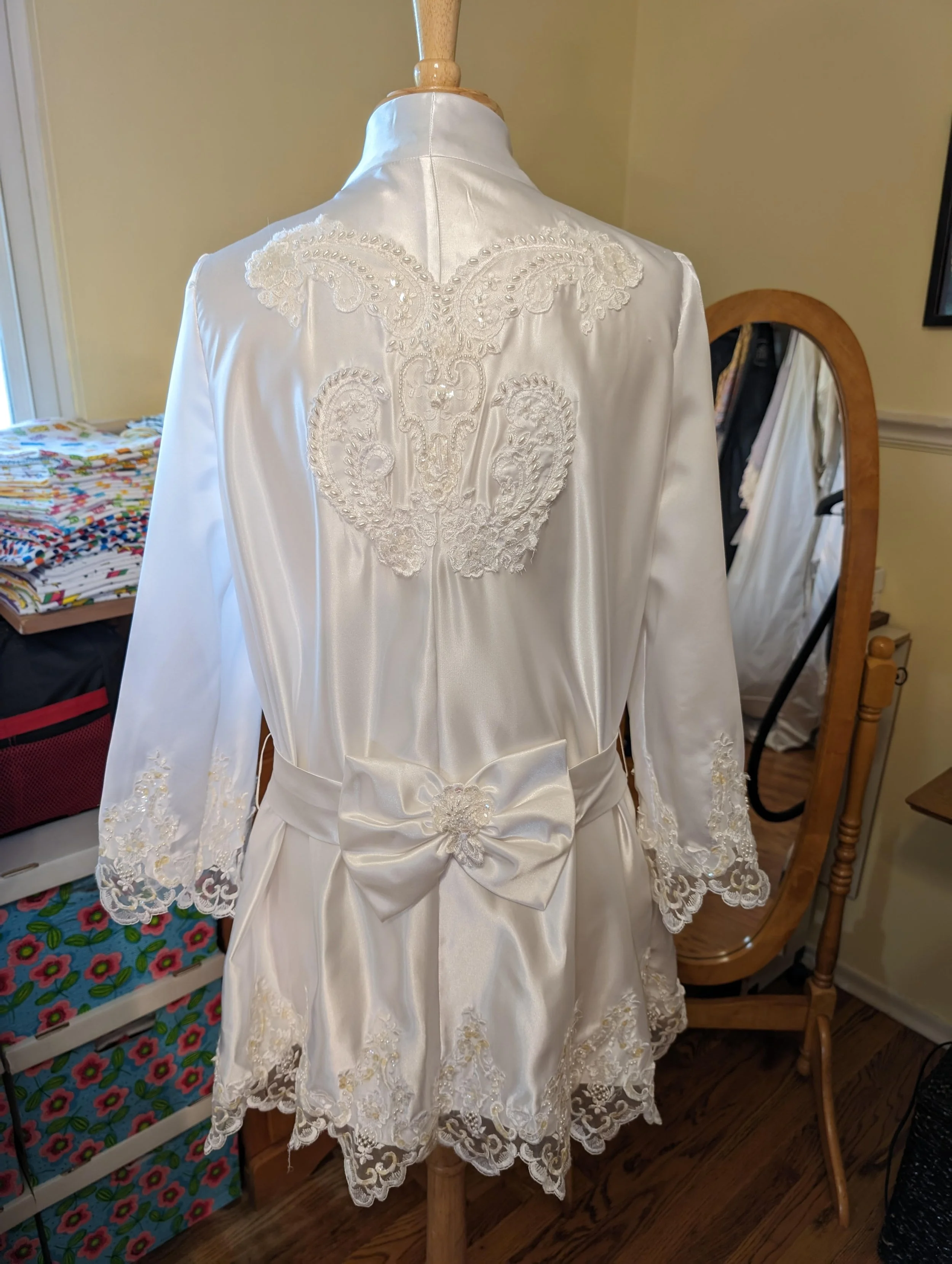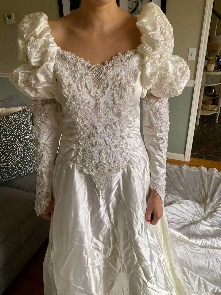 Before and After - A mother’s wedding dress to her daughter’s rehearsal dinner dress Before and After - A grandmother’s wedding dress to her grandchild’s baptism gown Before and After - A mother’s wedding dress to her daughter’s wedding morning robe Before and After - A mother’s wedding dress to her daughter’s cocktail dress and clutch Before and After - Replaced the skirt while maintaining the bodice Before and After - Recreated from another seamstress using lace from the bride and groom’s mothers’ wedding dresses